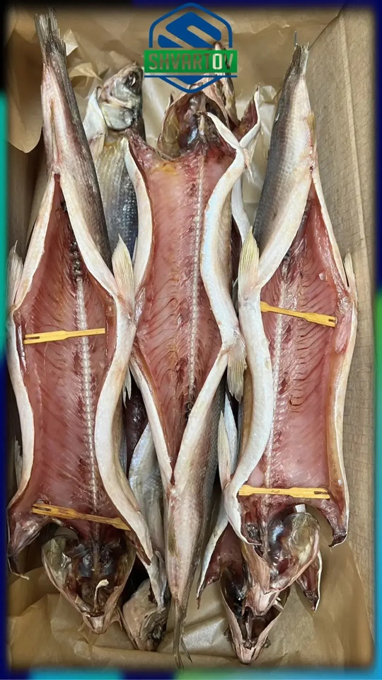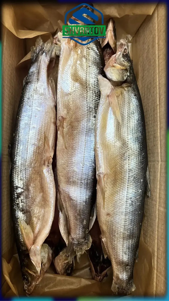 УПАКОВКА: Омуль вяленый провесной тушка потрошённый с головой +- 700 гр. Гофра коробка 1/8 тушек. Коробка +- 5,6 кг.