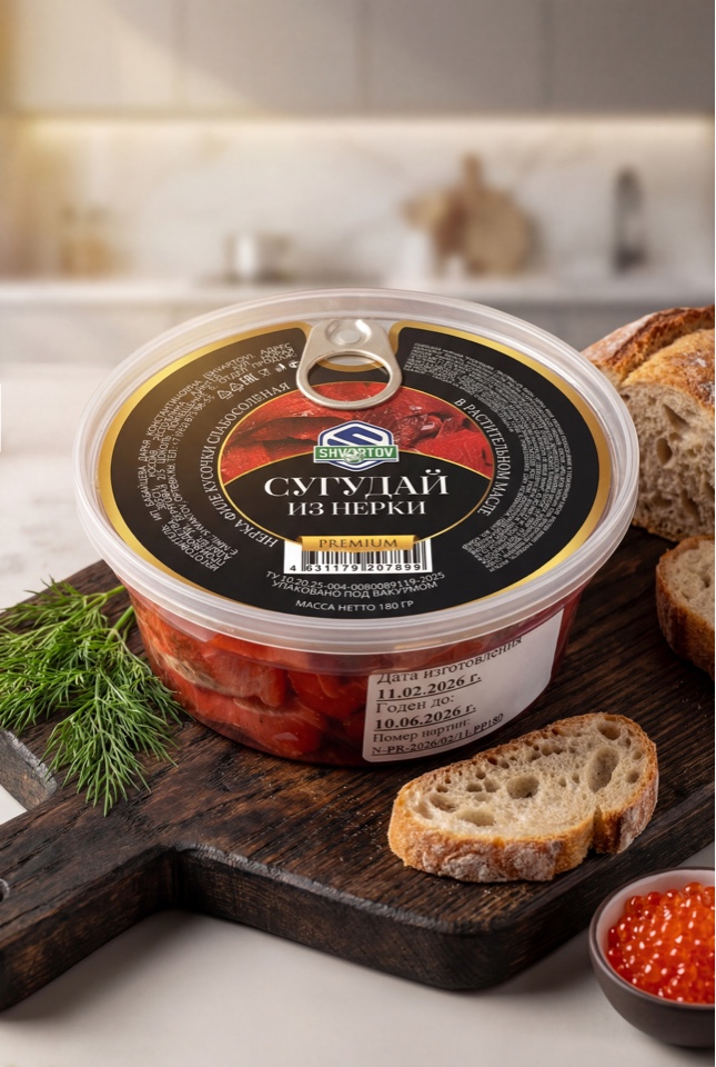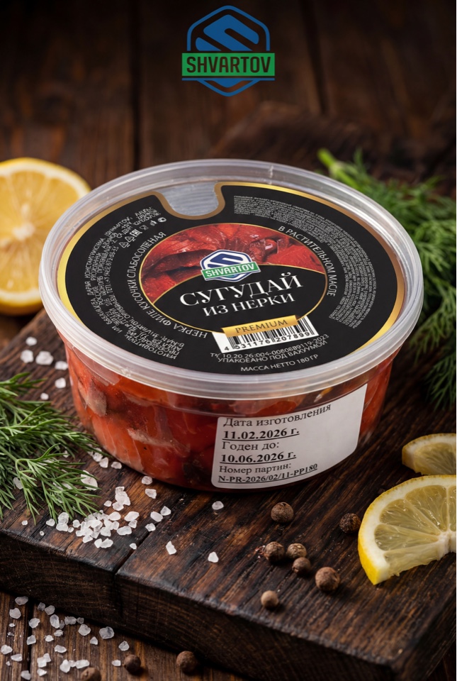 Пресервы из рыбы. Сугудай из нерки, PP/б. 180 гр. Евроключ.