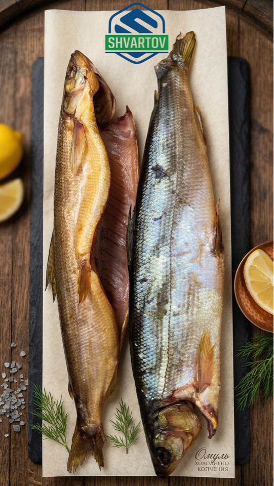 Омуль холодного копчения тушка потрошённая с головой.